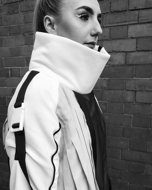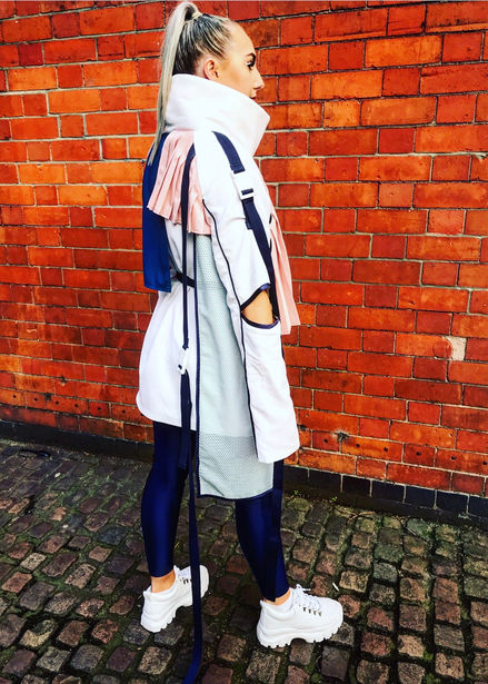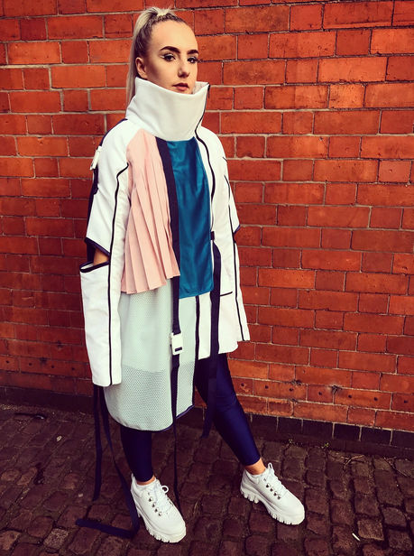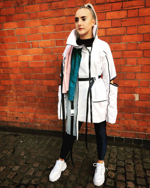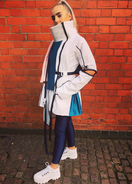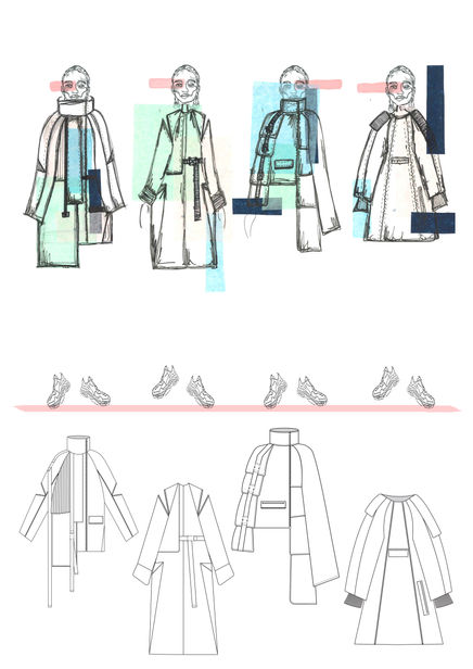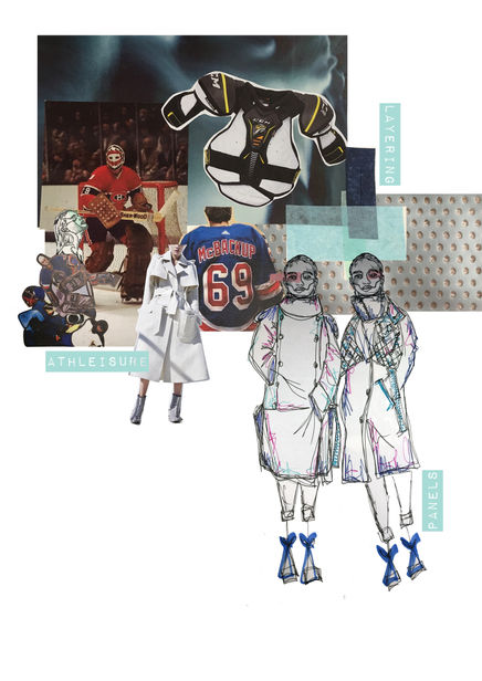 ATHLEISURE vibes are channeled throughout this collection of 4 OUTERWEAR pieces, loosely developed from the features constructed on the classic TRENCH COAT. Initial concept inspiration is derived from WATER and how it REFLECTS and moves, combining silhouettes of ICE HOCKEY jerseys and the idea of LAYERING and multi-purpose elements. My final garment is oversized, yet can be drawn in at the waist, has panels which create movement, along with exploring different fabrics and textures to achieve a SPORTY AESTHETIC.